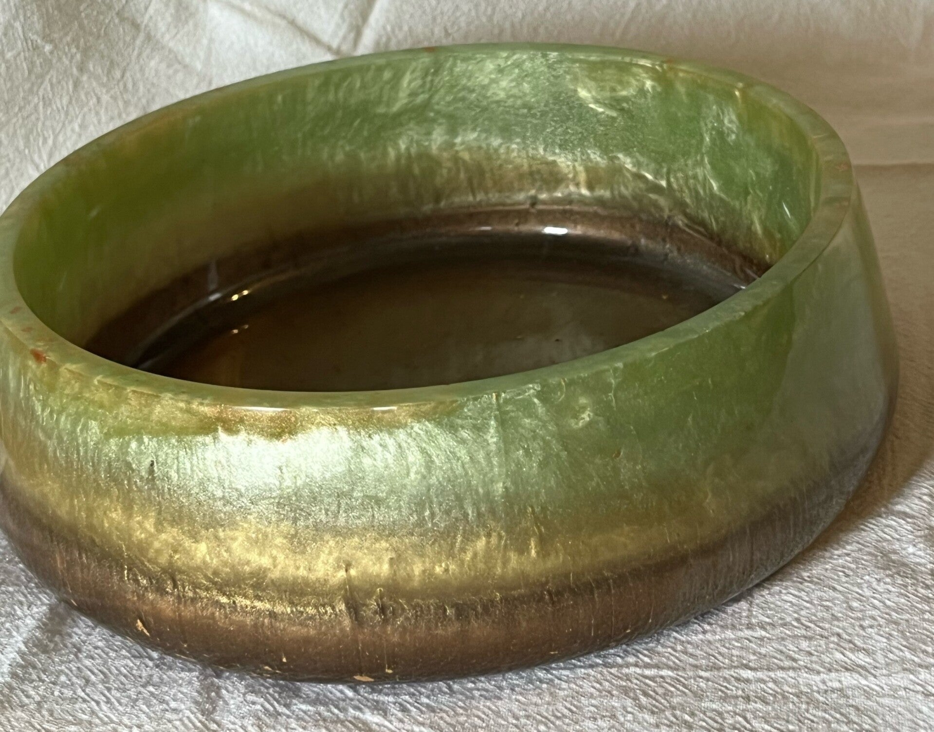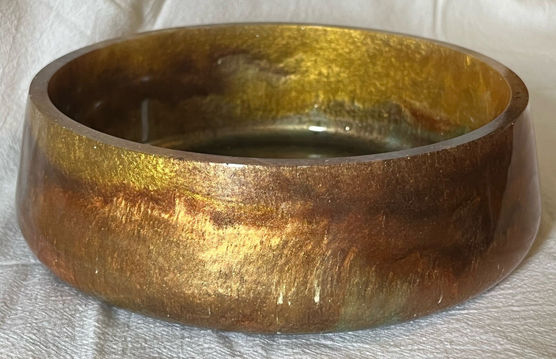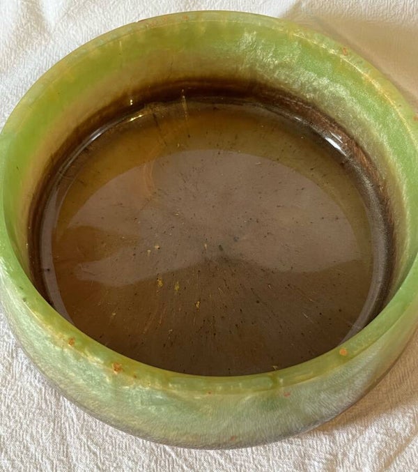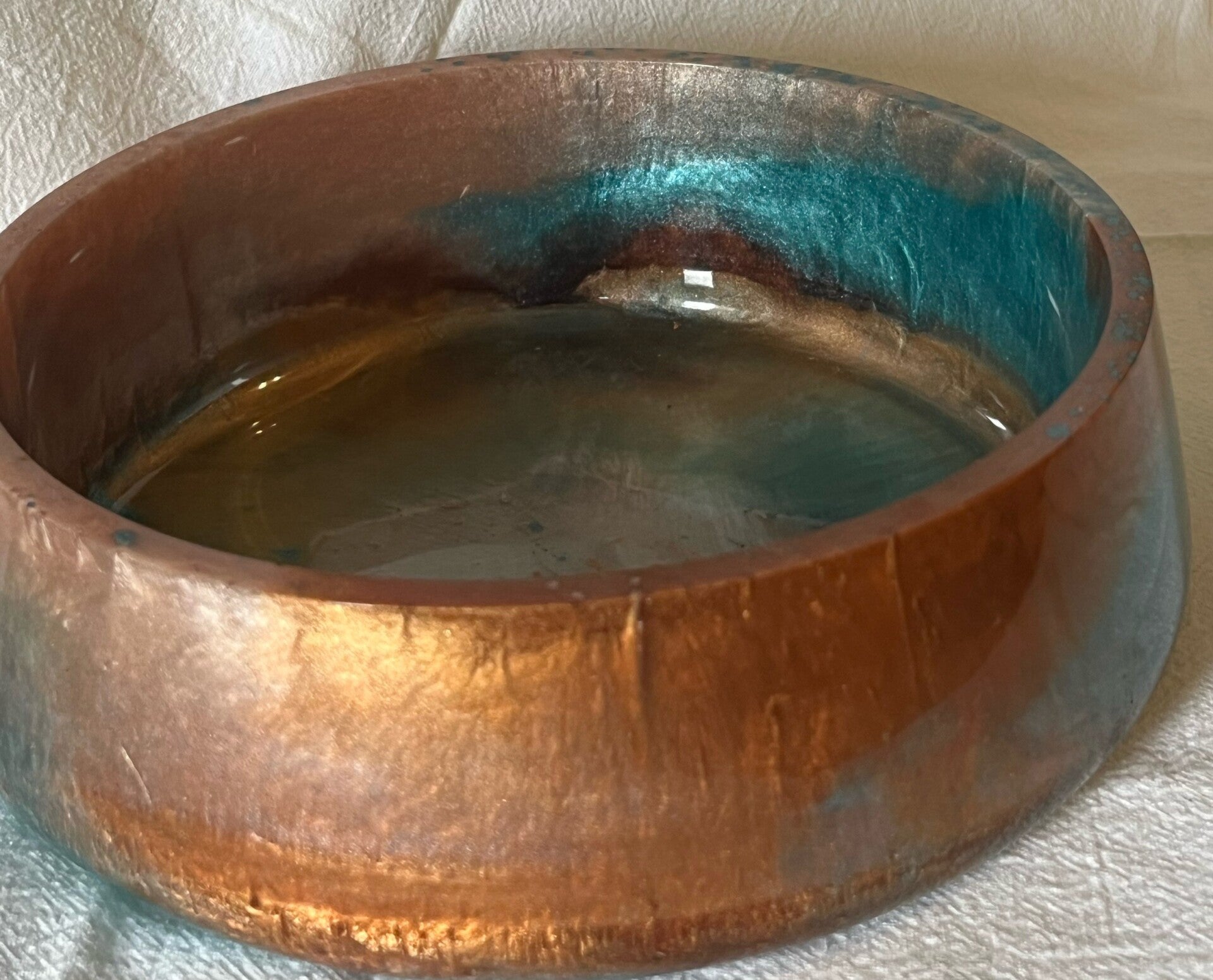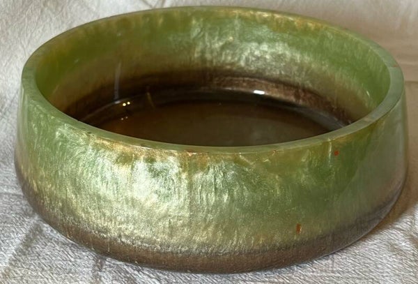 Flat bowls look great holding keys, change, etc. on the entry table or dresser. They are a tough, unique show piece that is made with food grade resin but also make a great planter for succulents. The uses for this bowl are as great as their one-of-a-kind color pattern. They are not dishwasher, oven or microwave safe. These are all approximately 7" wide by 2" high.