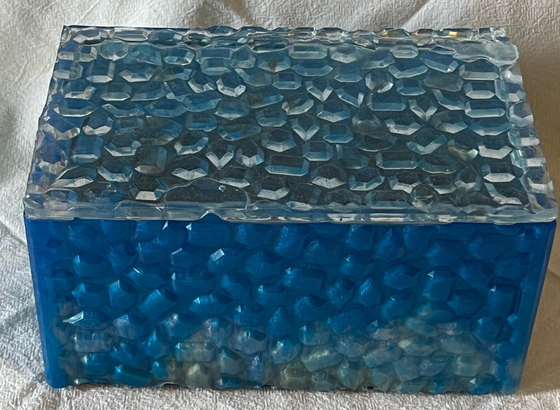 7 ½”long by 4 ¾” wide by 3 ¾” high blue rectangle box w/ lid