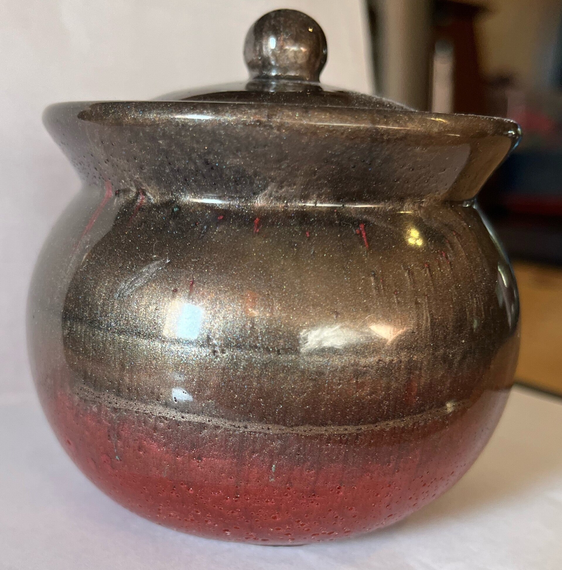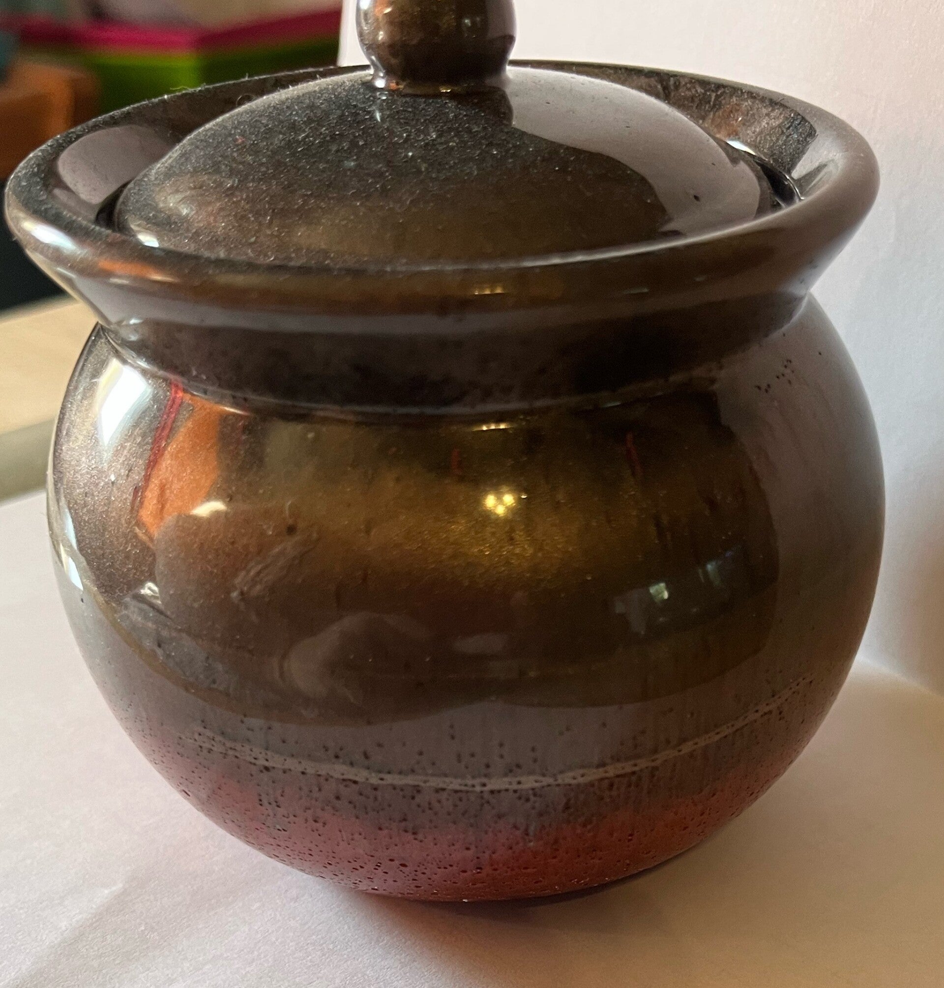 2 ½”wide by 3 ¼” wide brown/red bubble jar w/ lid