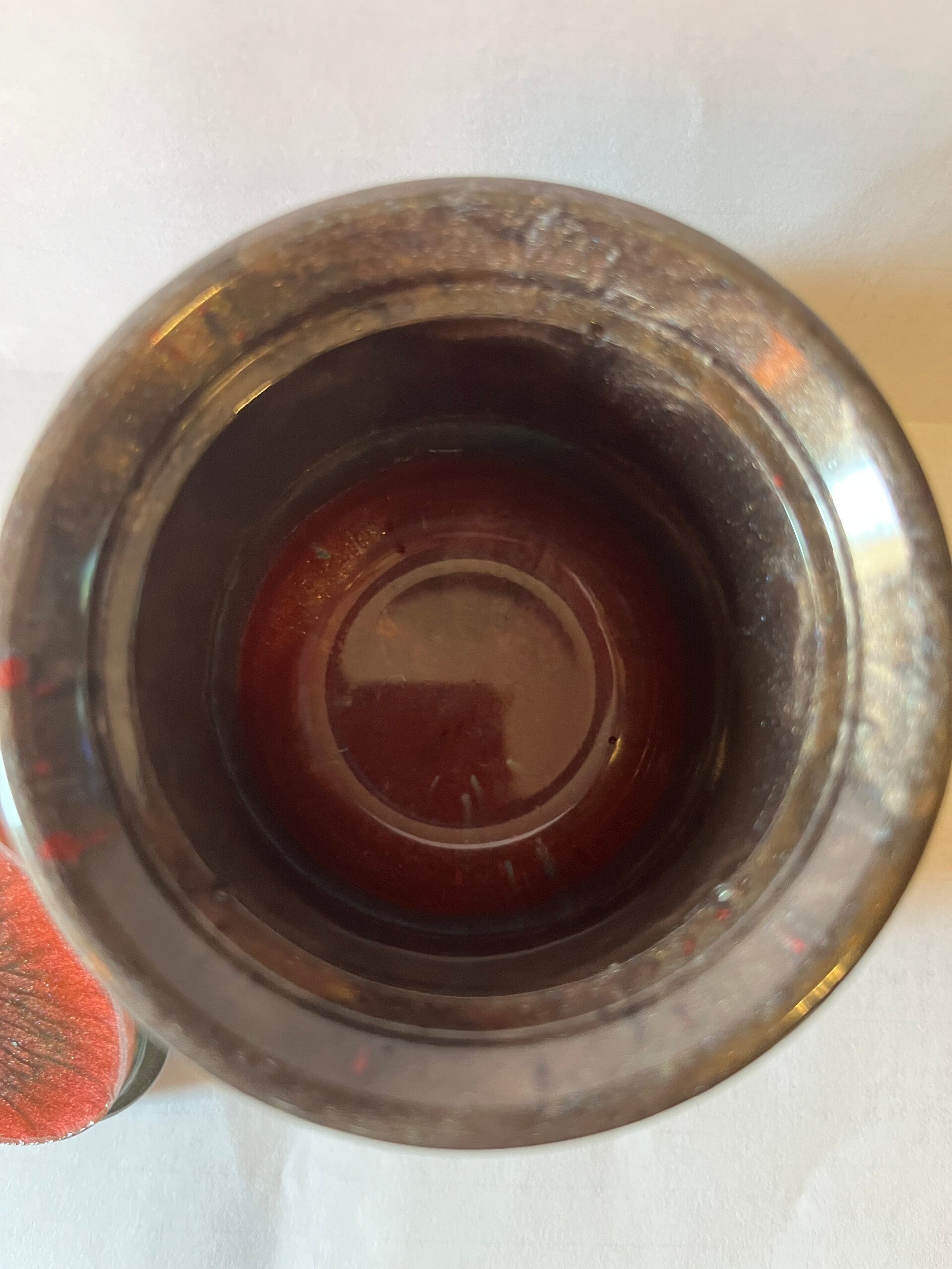 2 ½”wide by 3 ¼” wide brown/red bubble jar w/ lid - $15.00