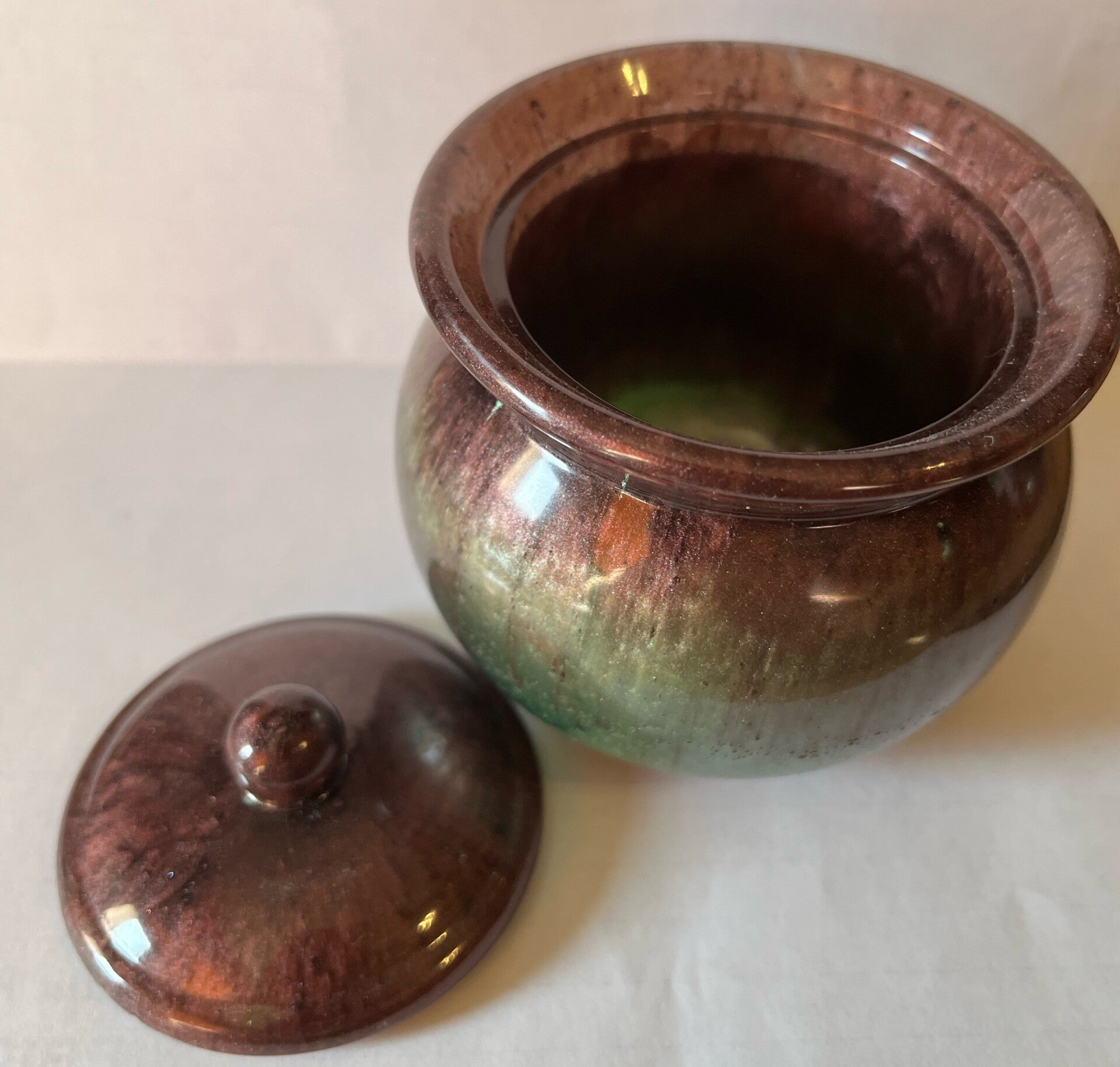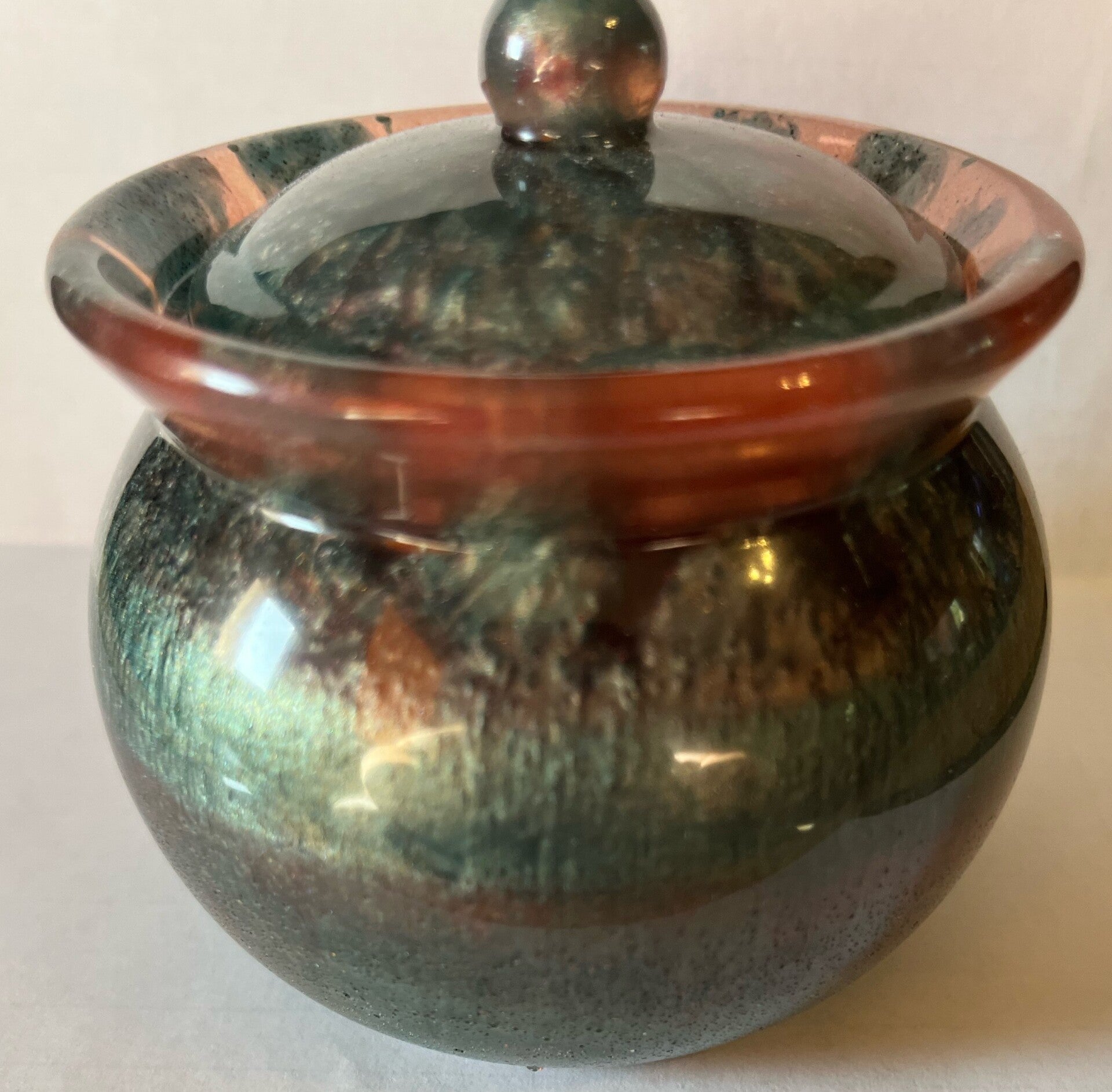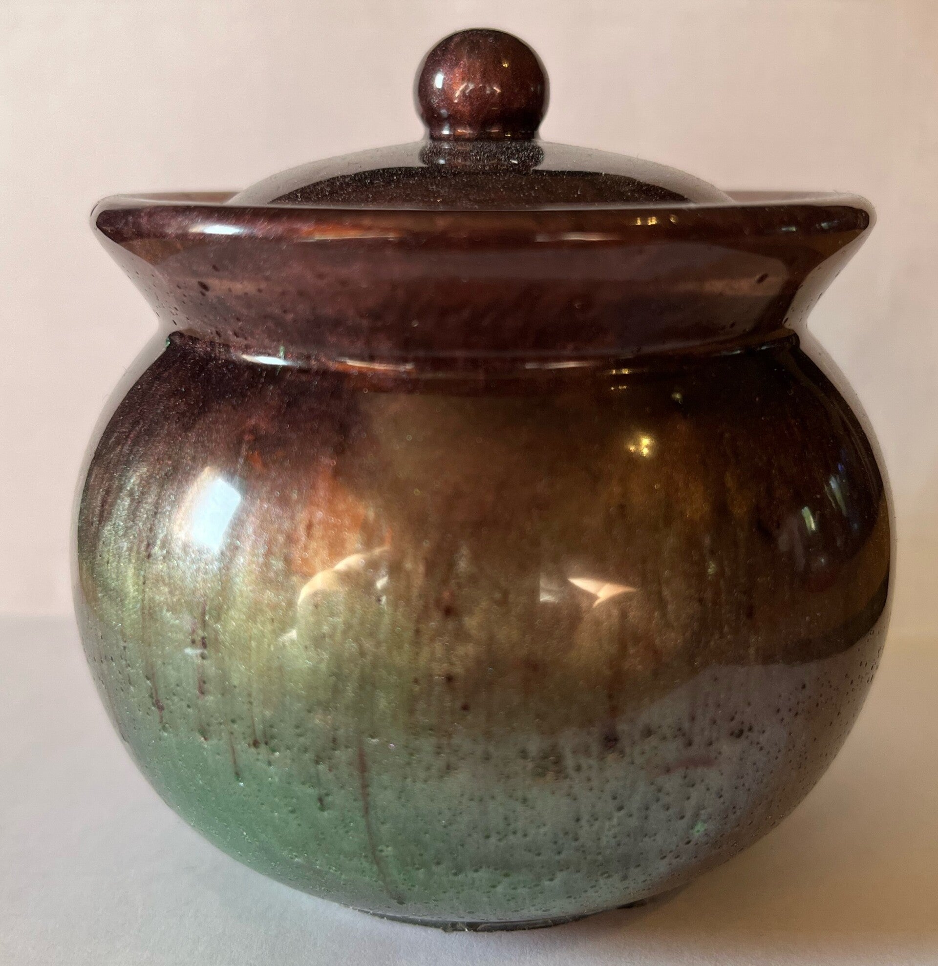 2 ½”wide by 3 ¼” wide brown/green bubble jar w/ lid - $15.00