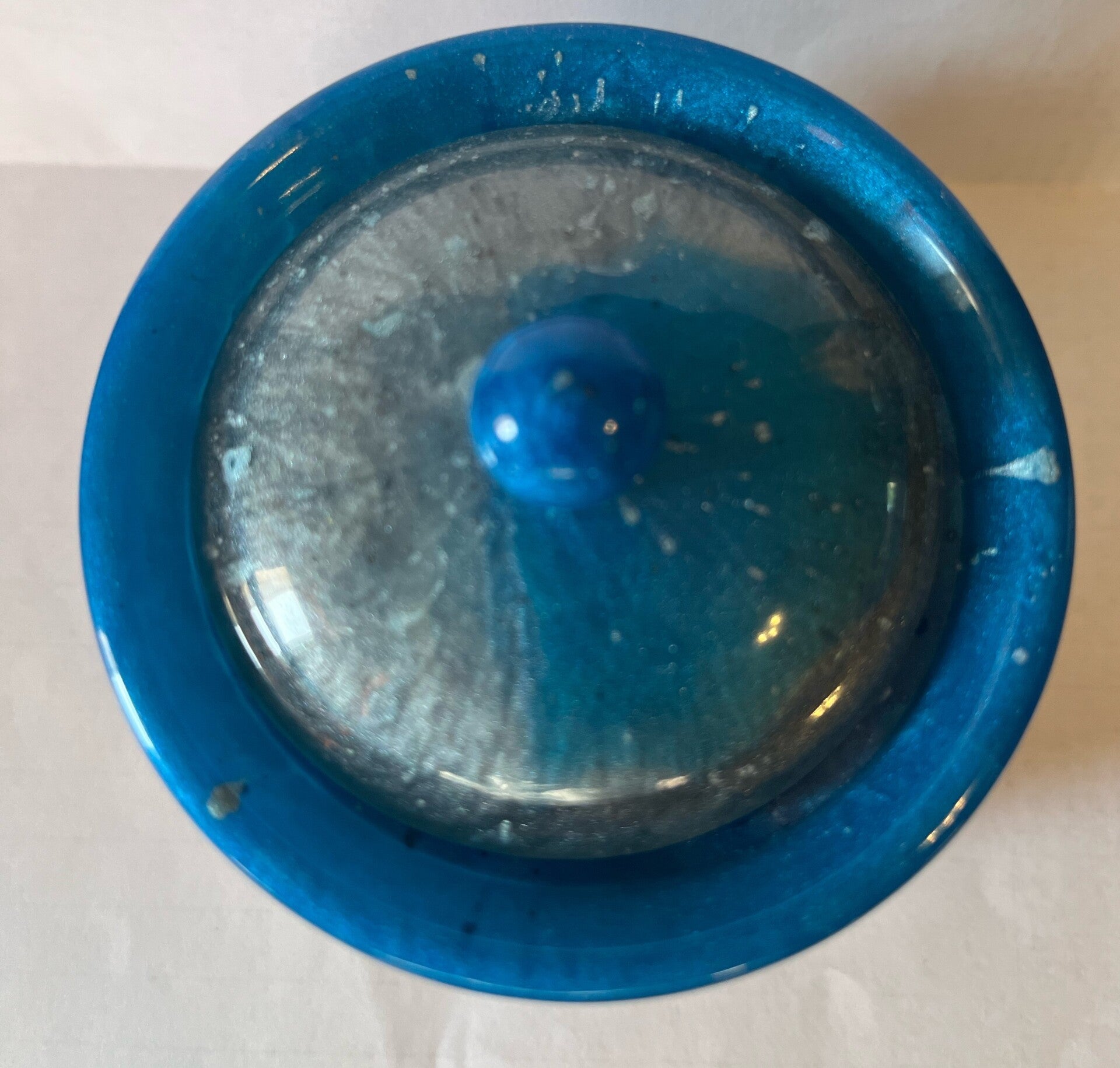 2 ½”wide by 3 ¼” wide blue/grey bubble jar w/ lid