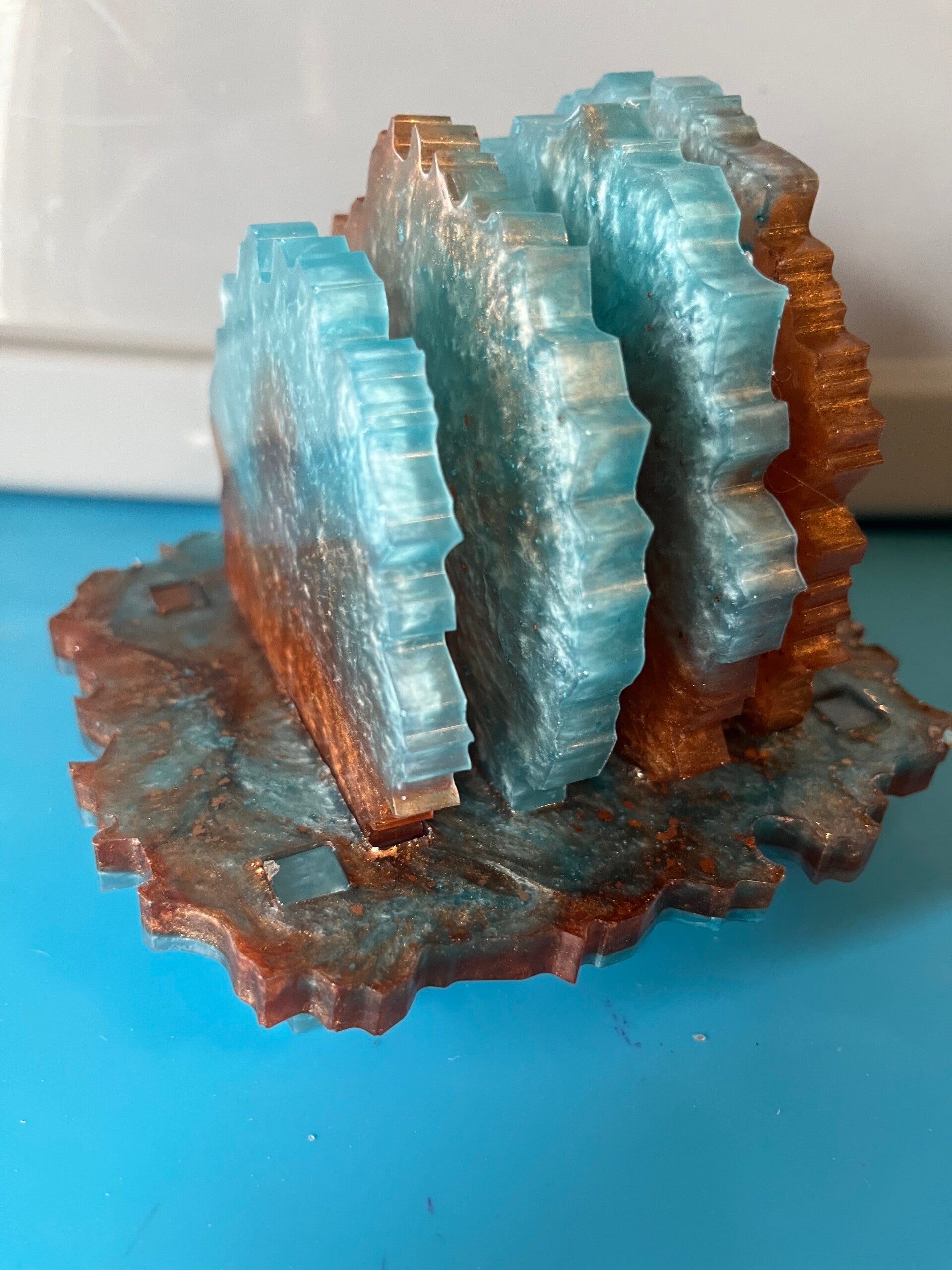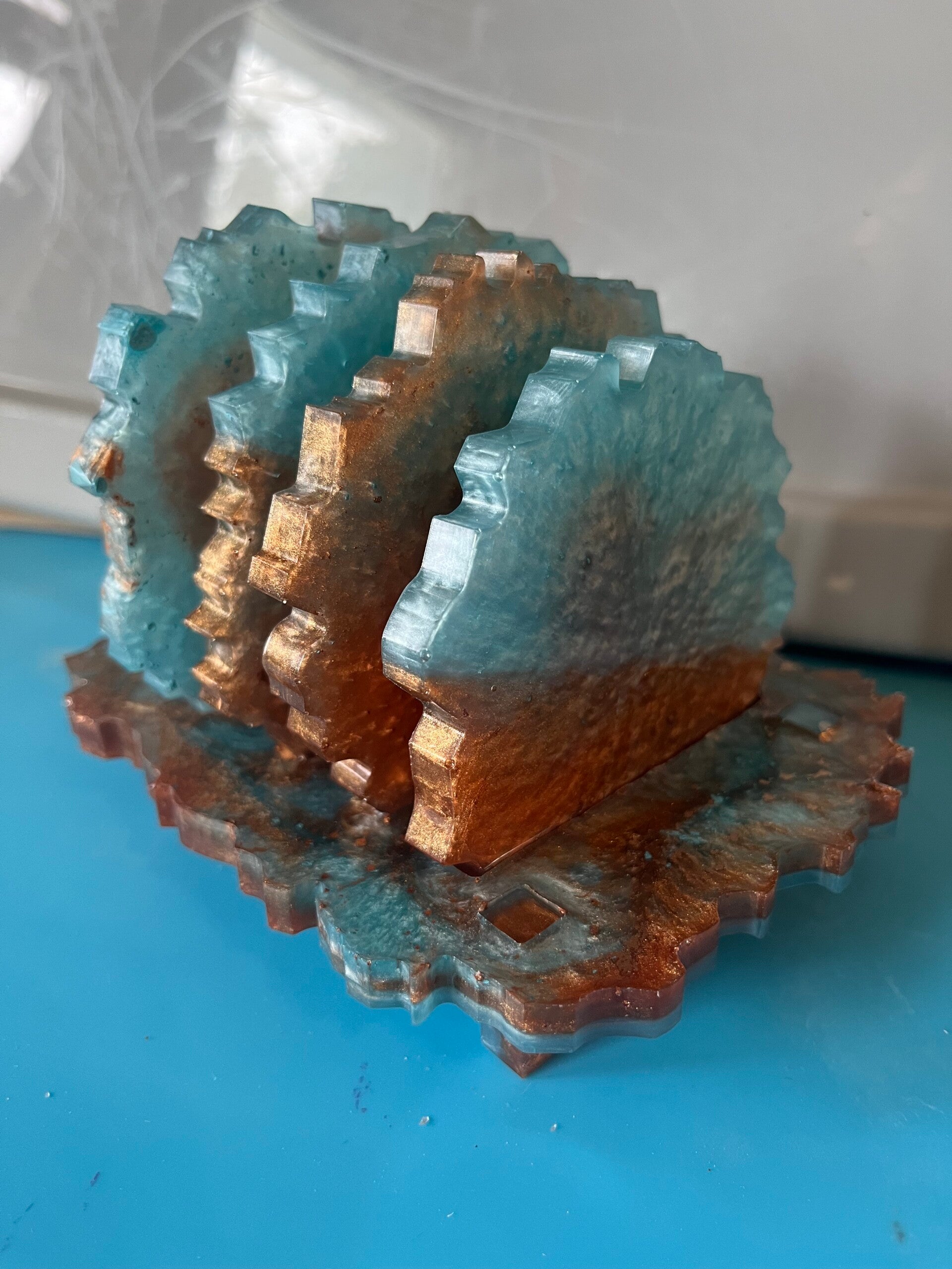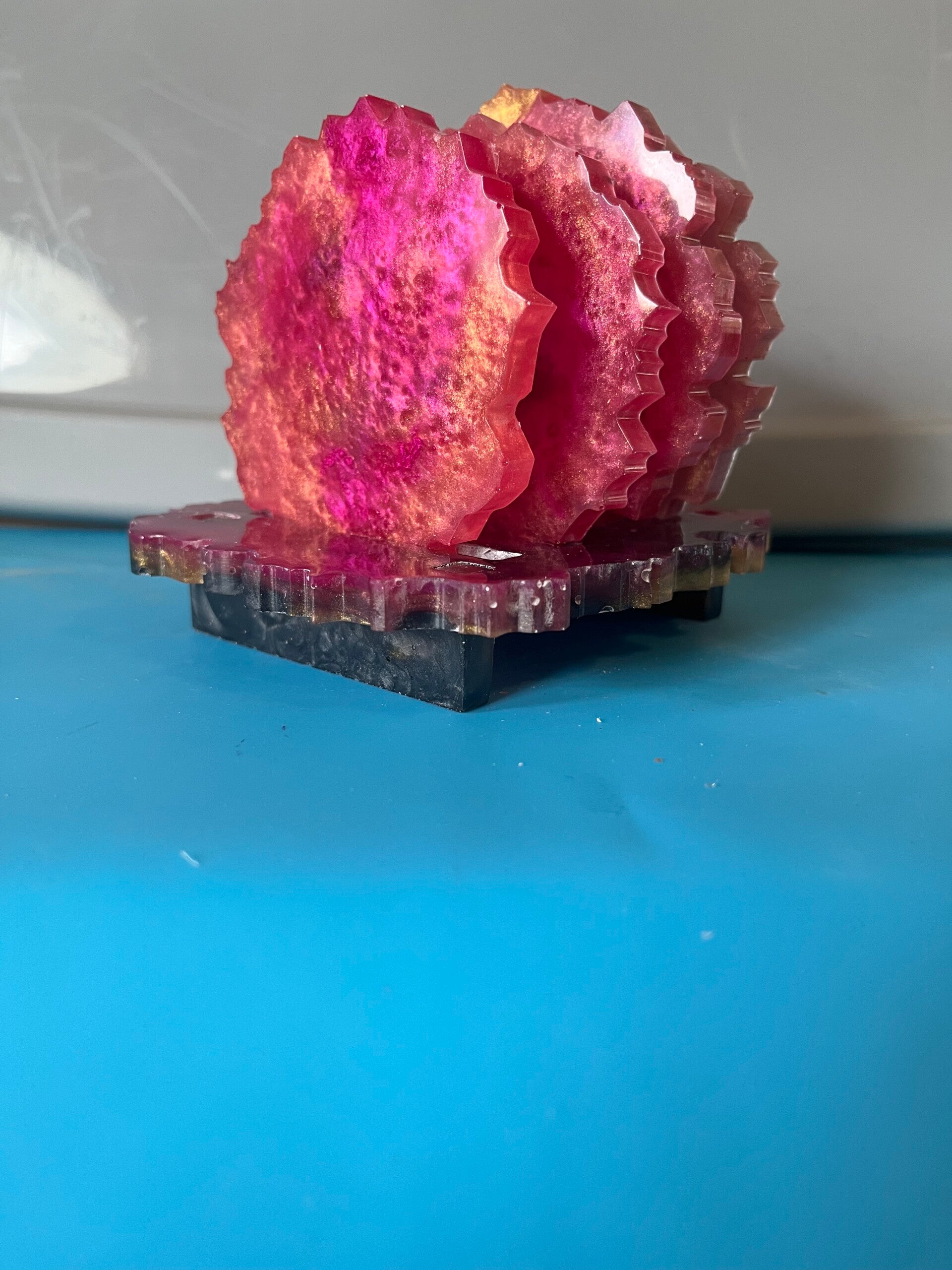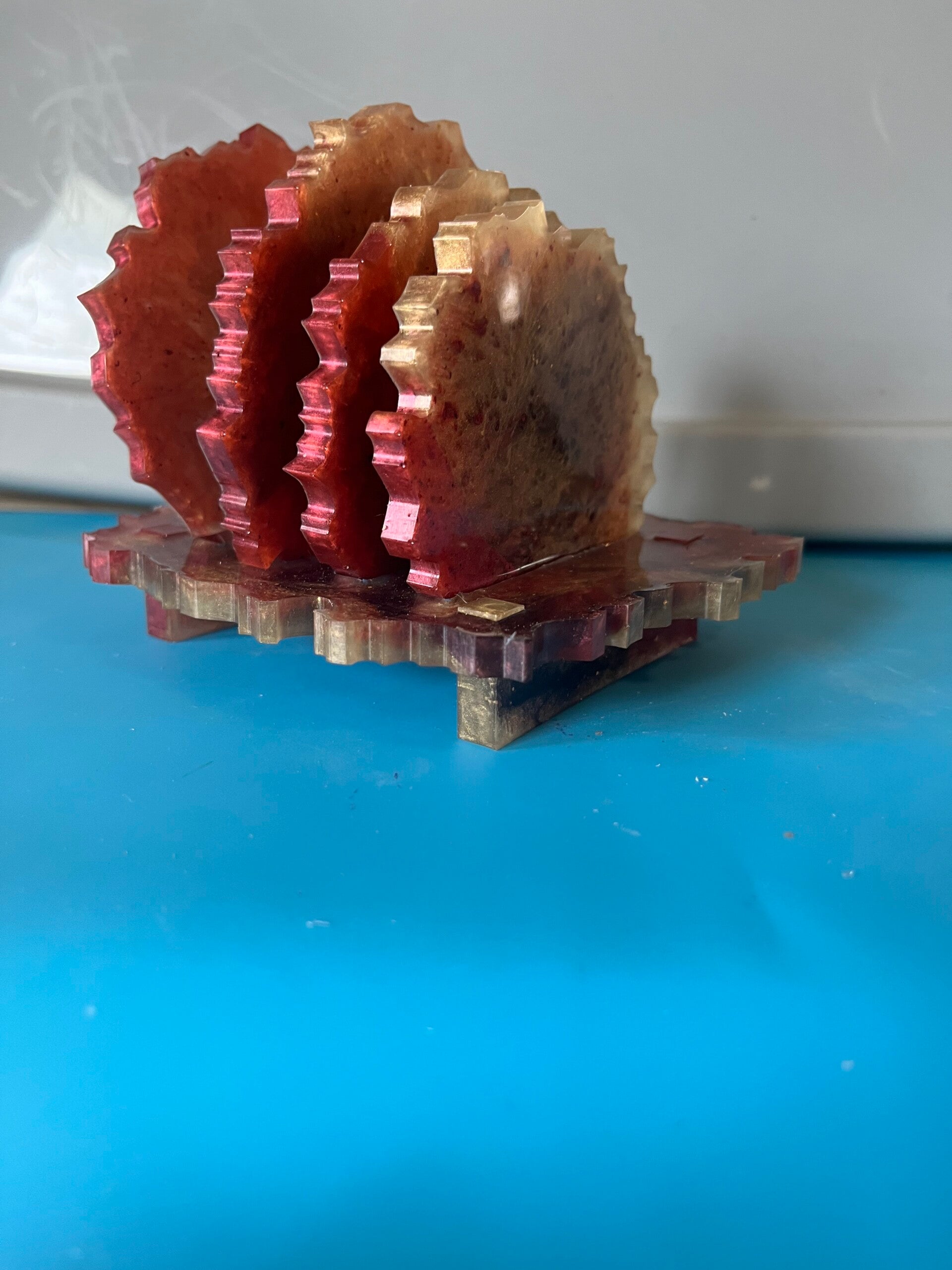 Stunning unique pieces of art with each coaster different from the other seem almost too eye catching to put a cup on them. Set of 4 coasters with a holder can be set to what color scheme you want. The holder is 5” by 4 ½” by 1” high. The coasters are ¼” thick by 3 ½” to 4” wide.